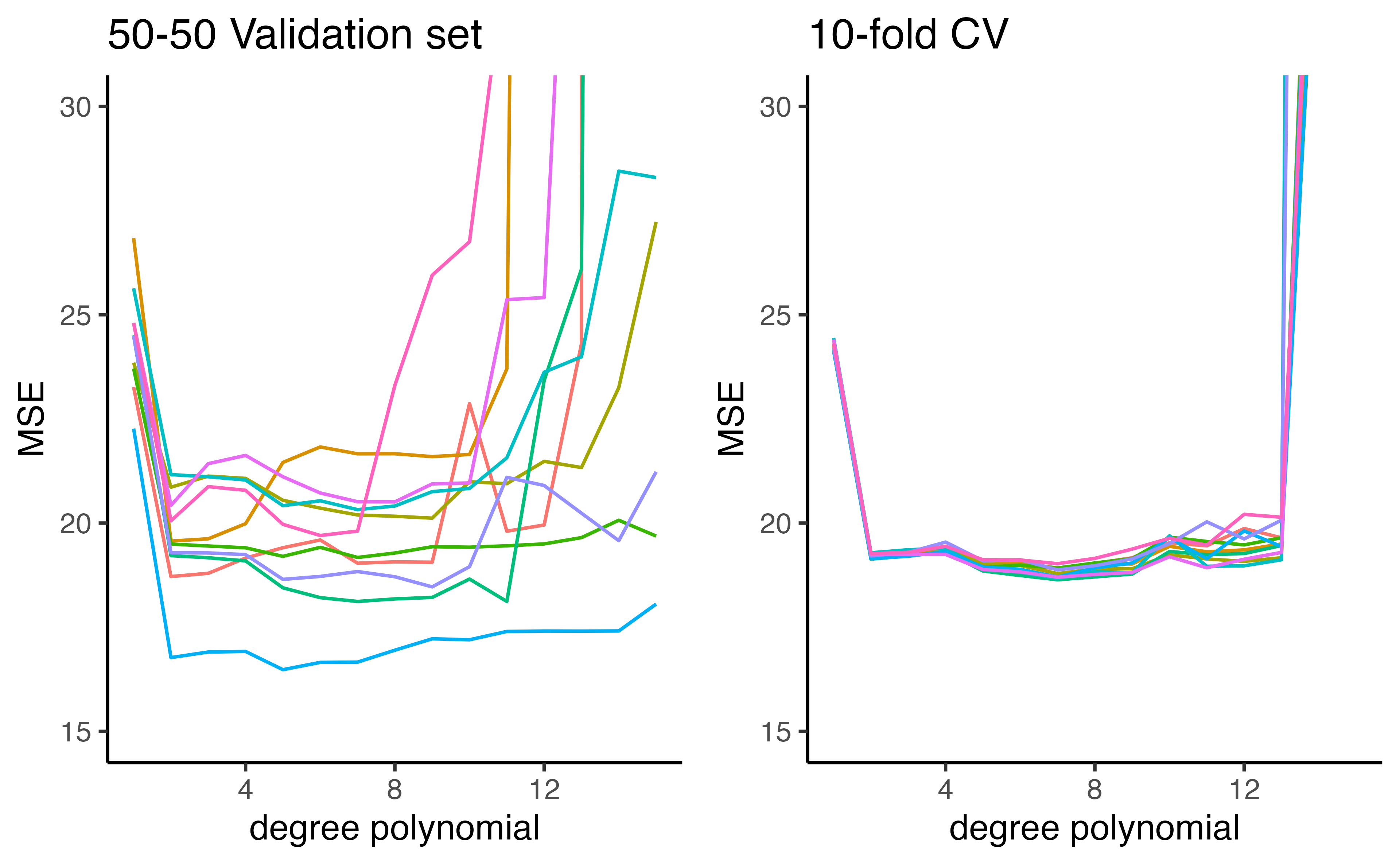 💡 Let’s instead find a way to estimate the test error by holding out a subset of the training observations from the model fitting process, and then applying the statistical learning method to those held out observations