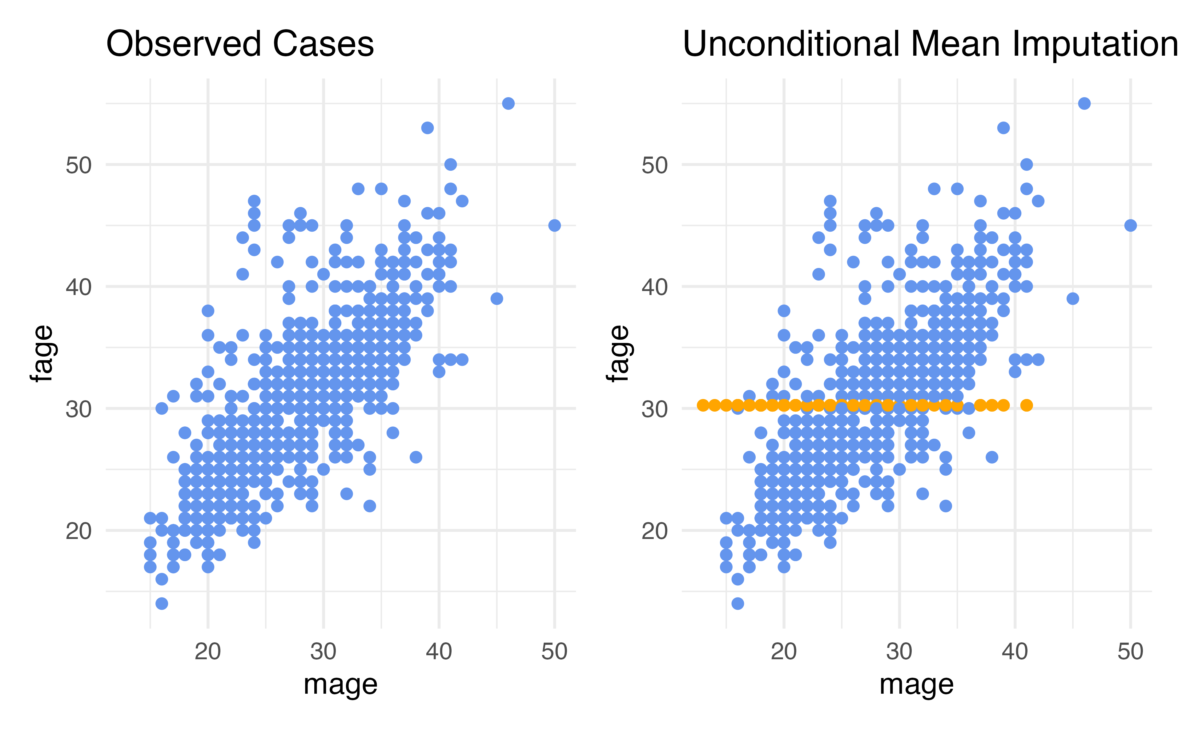 #   variable name ¹lowbirthweightFor our variable of interest, fage, we can conduct unconditional mean imputation (UMI) by