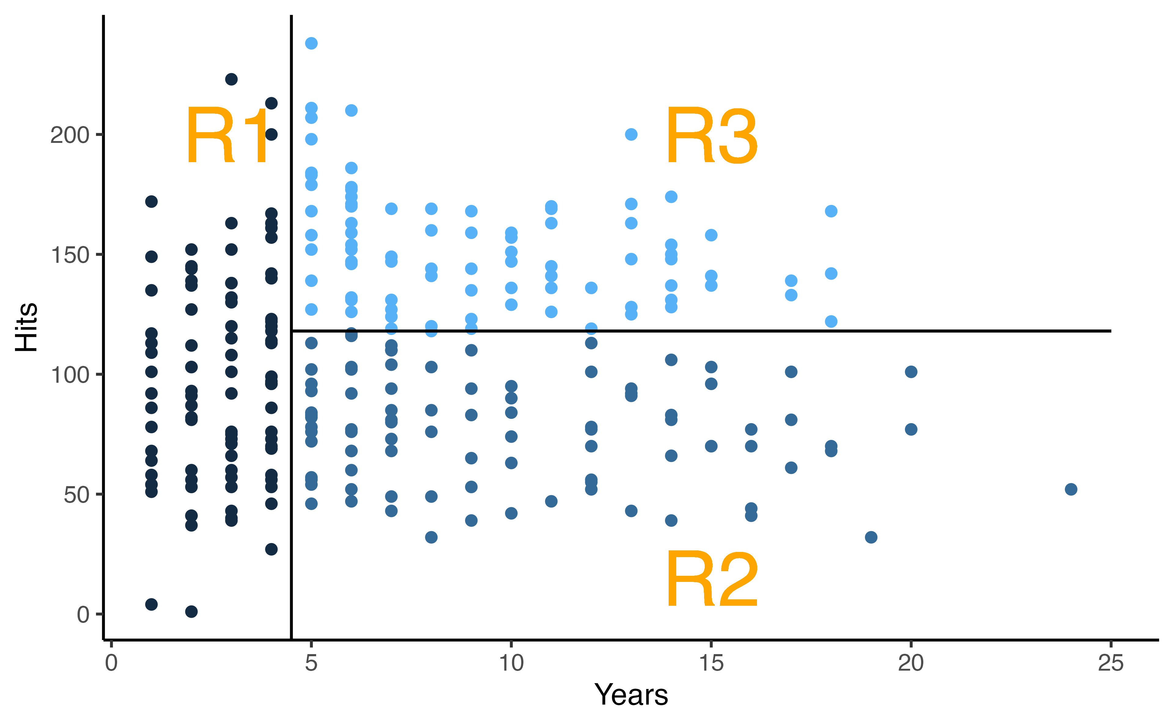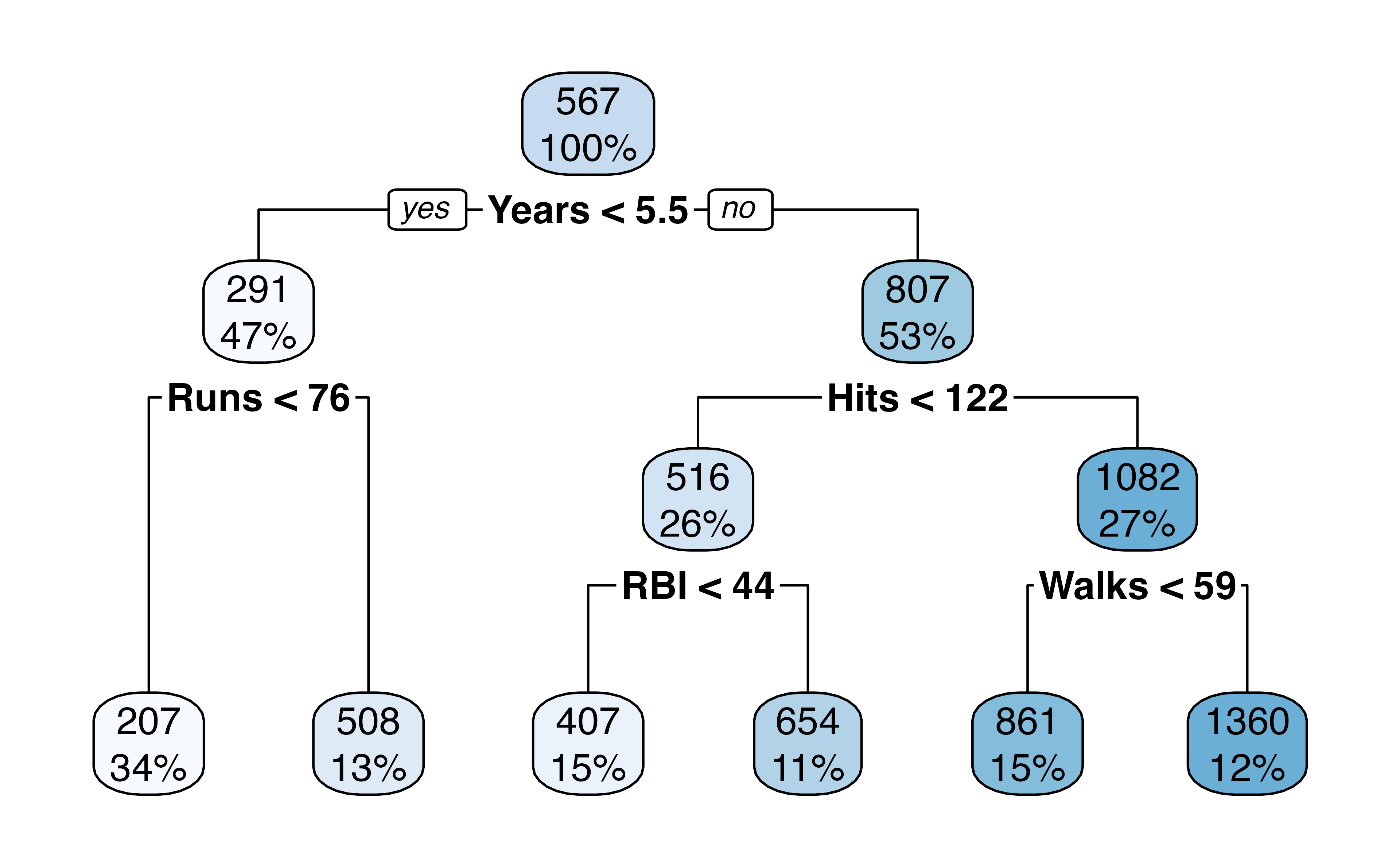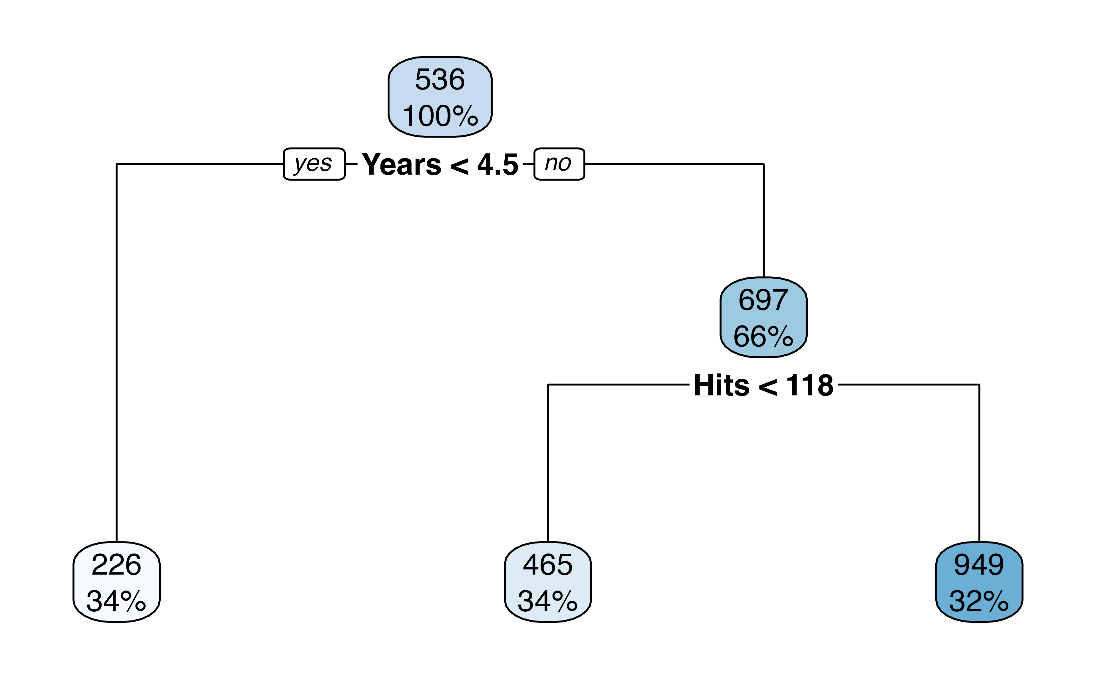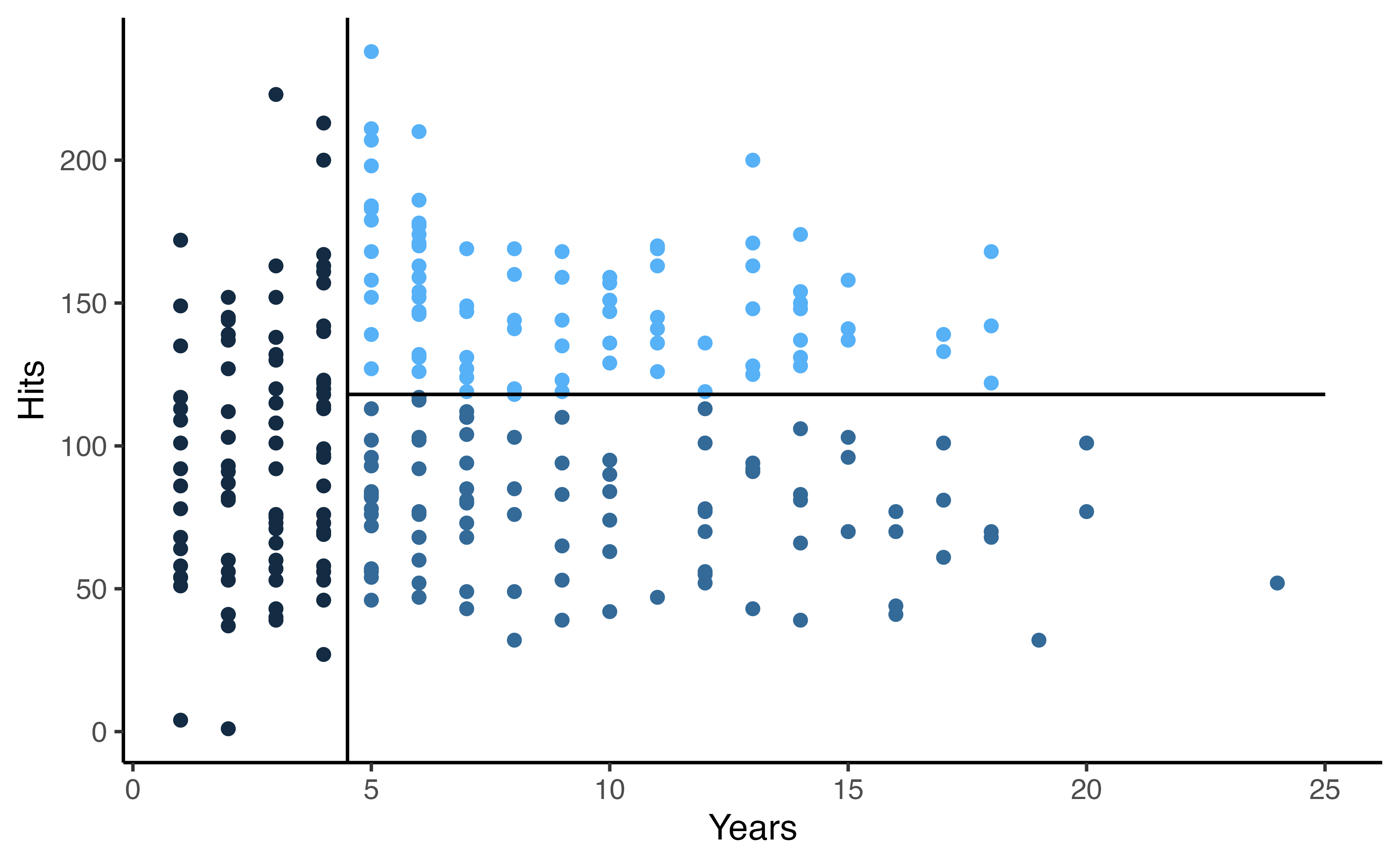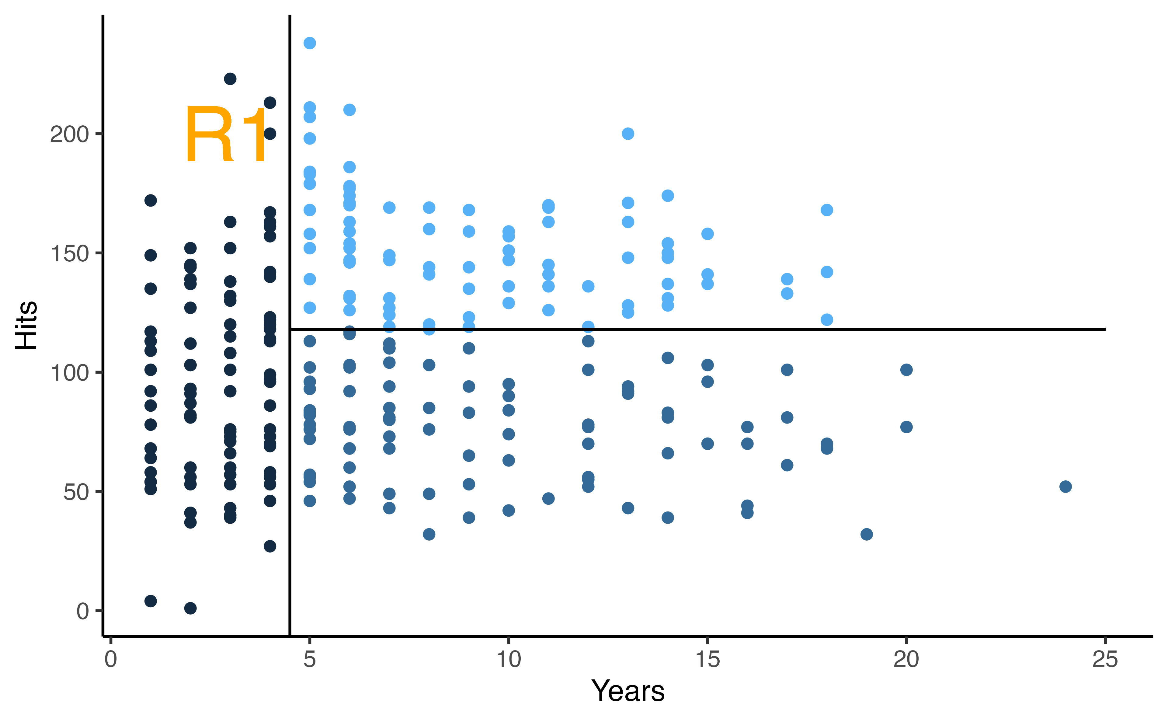 Hitters data from the ISLR 📦For example, the first internal node indicates that those to the left have less than 4.5 years in the major league, on the right have \(\geq\) 4.5 years.